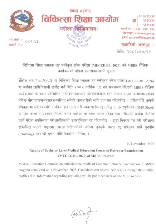 The Medical Education Commission has published the results of the Common Entrance Examination for the MBBS program conducted on Kartik 15, 2082 (November 1, 2025).