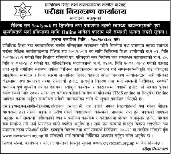 All eligible individuals who meet the eligibility criteria for full-fee approved programs and quota seats, as per the 'Diploma and Certificate Level Trainee Selection, Scholarship Distribution and Admission Directive, 2082', are required to submit their online application through the Examination Control Office's ITMS system on the following details: