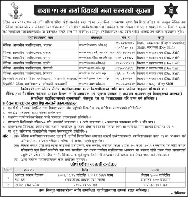 Sainik Awasiya Mahavidyalaya NEB Grade 11 Admission Notice